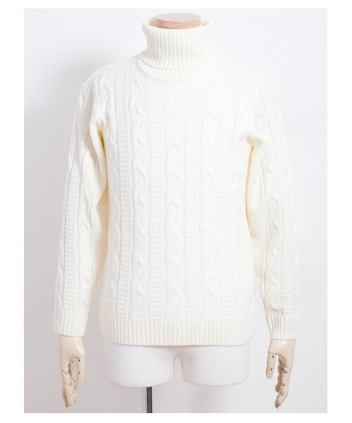 ハシゴ編みとケーブル柄で、全体に縦ラインを表現したすっきりした印象のタートルネックニットプルオーバー。さらっとした肌感の軽めのニット素材で春まで使える一枚。脇下から袖にかけては、細かなバスケット編みに変えているところが凝った印象。ベストなどとも合わせやすいベーシックな型。
