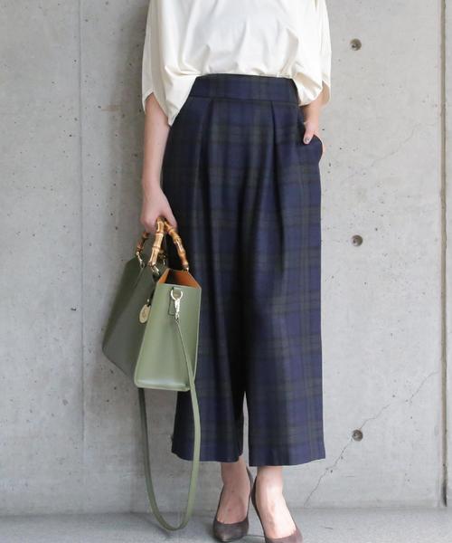 大人チェックパンツ! 光沢感のあるざっくりとした生地を使用したハイウエストパンツです。 この秋注目のチェック柄を、シックで大人っぽい表情でこなしたこちら、後ろ側はゴム仕様なので、ノンストレスで着て頂けます。 お仕事の時も、普段使いにもコーディネートの幅も広い便利パンツです。