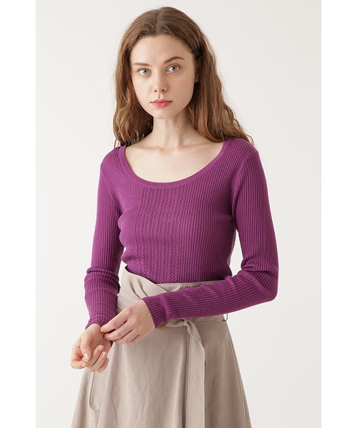 広めのUネックがスッキリした顔周りを作るリブニット。シルク85%カシミヤ15%のリッチ感のある素材が、とても柔らかく、肌触りと着心地が良い仕上がりです。中央で変化を入れた細かいケーブル柄の編地がアクセントになり、身頃はスリムフィットする女性らしいデザイン。スカートのウエストインから、レイヤードワンピースのインナーまで着られる一枚です。