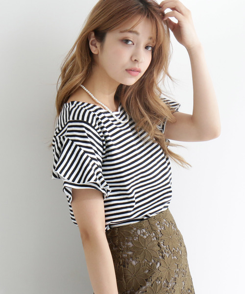 秋にかけて着られるスリーブTシャツ。肌触りがよいコットン素材で仕立て、2層になったラッフル袖がデザインポイントに。スリーブデザインが可愛く振り切れて、フェミニンなスカートやカジュアルパンツまで相性バツグンです。Tシャツ感覚で着回し出来るアイテムです。