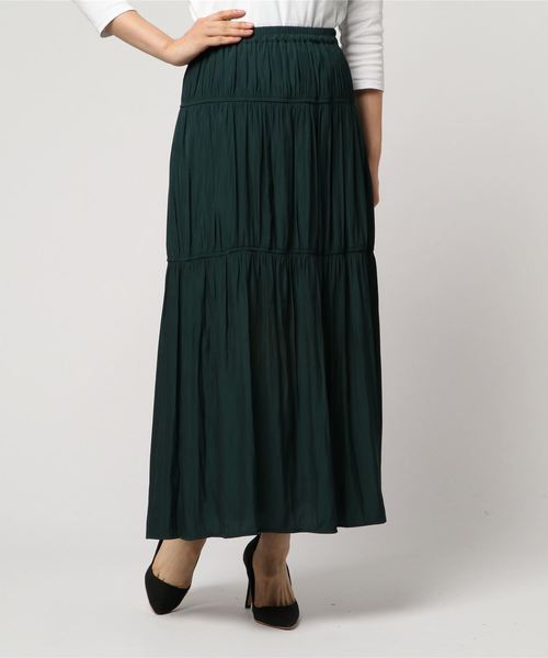 シャーリングのティアードギャザーデザインがインパクトのあるロング丈スカート。微光沢のあるパウダーサテン素材を使い上品ながらも、細かなギャザーを寄せたデザインが可愛らしさもプラスします。ダークトーンの秋カラー展開なので晩夏から取り入れやすいお勧めアイテムです。