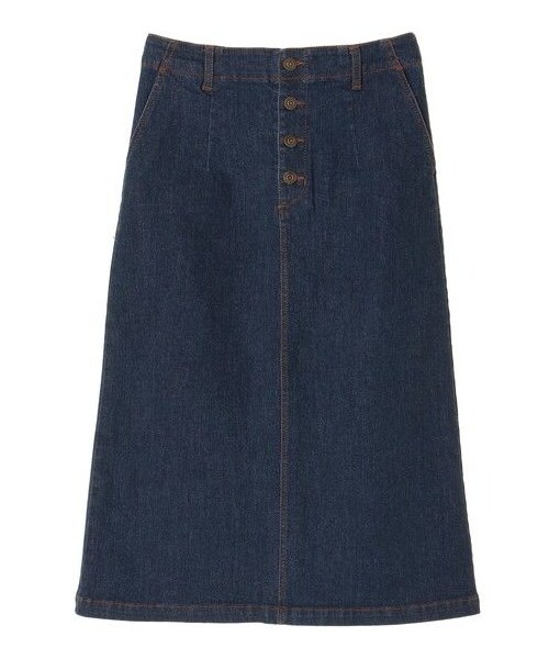 フロント釦がポイントのデニムタイトスカート。ひざ下の長めの丈が大人っぽい印象。伸縮性のあるストレッチ素材なので着心地も抜群。トップスインもアウトもバランスよく着こなしていただけます。