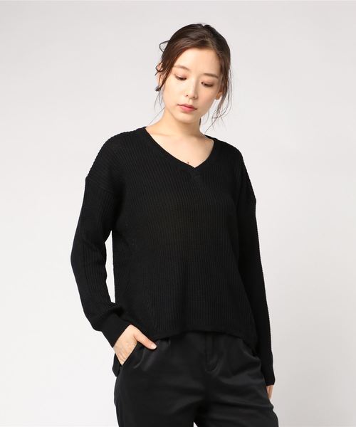 優しい表情のワッフル編みが、トレンドライクなポイントになったロングスリーブプルオーバー。デコルテをすっきり魅せる両Vネックが、女性らしさを引き立てます。合わせやすいベーシックなカラーバリエーションとミニマルなデザインで、コーディネート力抜群のひと品です。