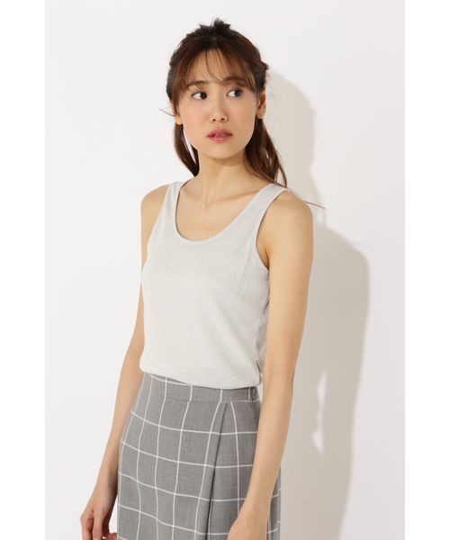 さり気なく煌くラメ入り素材で仕立てたタンクトップ。体に程よくフィットする細身のシルエットに、さらりとした肌触りで着心地も◎。シンプルなルックスながら、ラメがアクセントとなりコーディネイトに上品な華やかさをプラスしてくれます。広めに開いたネックも使いやすく、インナーとしてシーズンレスで重宝する1枚です。