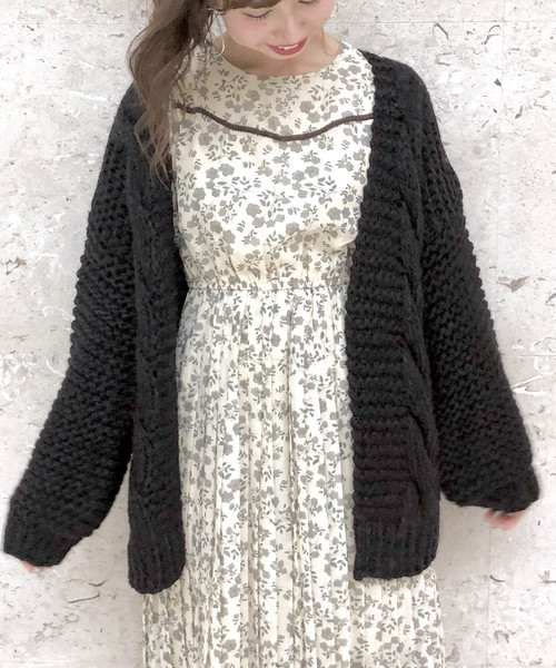 ■ほっこり感に愛着のわく手編みカーデ■ ボリュームのある袖とインナーがひびいてこないゆったりとしたアームホールがフェミニンなルーズ感を演出。 大胆に施されたケーブルが温かみのある一枚。 しっとりと柔らかい着心地が秋冬のワードローブのメインアイテムになりそう。 ヒップラインにかかるくらいの丈感は、ショートボトムからフルレングスまで幅広いボトムと相性◎