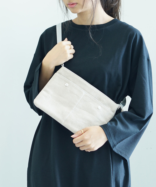 秋冬素材のサコッシュです。しっとりとした肌触りが特徴のコーデュロイ生地を使用しています。コンパクトなサイズ感ながら長財布も収納できるサイズです。2つのボタンがデザインのアクセントとなっています。トレンド感がある一押しのアイテムです。