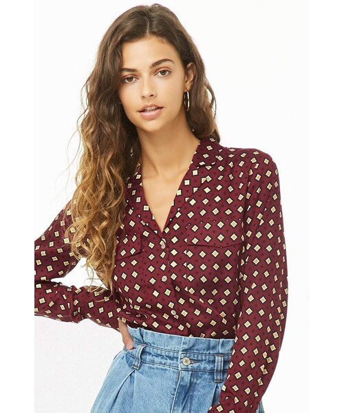 Details A satin shirt featuring an allover geo print, notched collar, chest flap pockets, long sleeves with button cuffs, button front, and a curved hem. Content + Care - 100% polyester - Machine wash cold Size + Fit - Model is 5'8" and wearing a Small