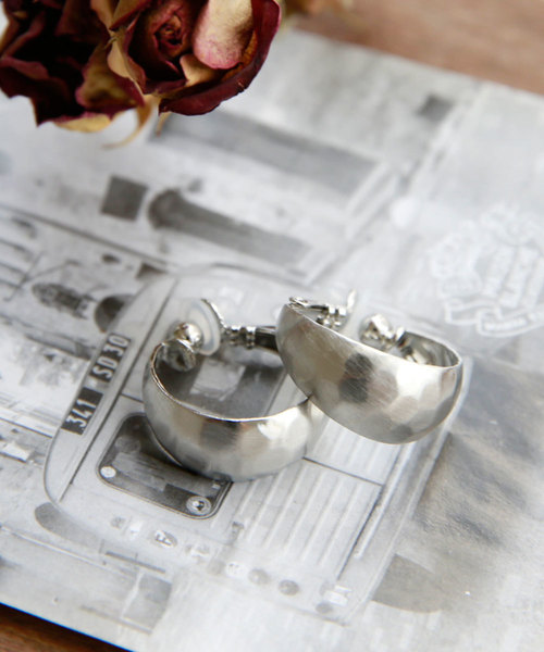 さらっとしたマットな質感のフープイヤリングに、槌目加工を施しました。小ぶりながらも、幅を持たせたぽてっとしたフォルムでほどよい存在感。丸みのあるシルエットと温もりを感じられる優しい色合いが女性らしく、品のある印象です。痛みを和らげるシリコンパッド付きでストレスも少なく、毎日使いたくなるアイテムです。結婚式/パーティー/ドレスアップ/2次会/オケージョン