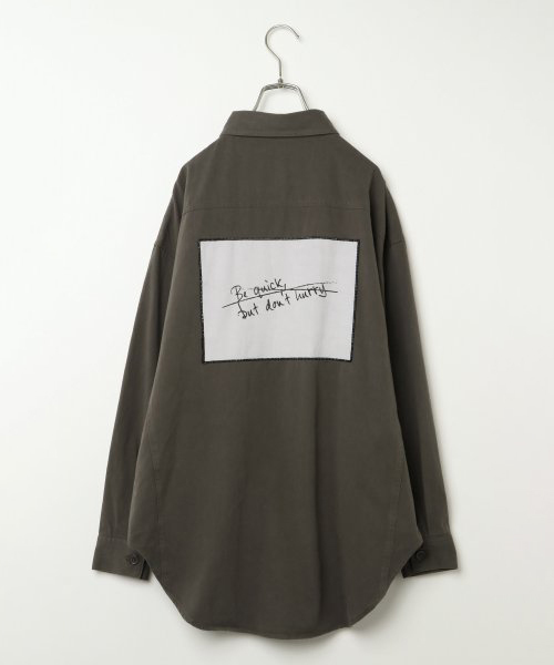 秋冬にぴったりのミリタリーカラーのビッグシャツです。 背中には手描き風ロゴのシートをパッチ! いたずら心をくすぐるユニークデザインです。 ゆったり気味に着て、ラフさをコーデのポイントに。 Tシャツインしてレイヤードするなど、秋口の羽織りとしても活躍します。 [クリーニング] 手洗い可 ドライクリーニング可(F)