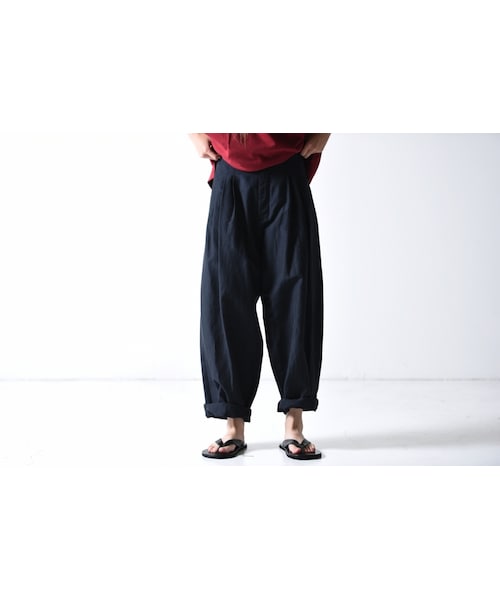 YANTORならではのタックとテーパードのバランスが絶妙な3タックワイドパンツ。 裾に向かって緩やかなテーパードがかかったフォルムが特徴。 3つのタックが前後合わせて4カ所に入っています。 裾に向かって細くなっているので生地の溜まりによるきれいな皺が入ります。 大きめに着用して生地の分量でボリュームを出すスタイルが◎ 素材は麻の表情がありながら綺麗な印象を併せ持つスラブ糸を使用したオリジナルリネンウール。 軽くて涼しく、またリラックスして履けるパンツでありながら、高級感のあるパンツ。 size:Mでユニセックスに着用可能。 Slab Linen Wool素材のトップスとセットアップになります。
