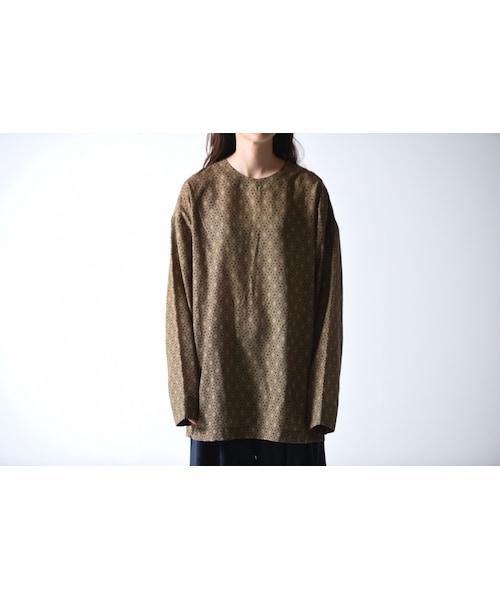 YANTORらしく身体に沿って生地が落ちるフリーサイズ感覚のカットソー。 イスラムの幾何学柄を全面に配した贅沢な一着。 「永遠」「継続」という意味があるイスラム幾何学柄をオリジナルで制作し、日本でプリントしたロングプルオーバー。ドロップショルダーで肩の位置を決めていないため様々な体型の方に着用して頂けます。 シンプルながら肩のボタン、サイドスリット、背面のタック等細部にまでこだわりのある一着。 独特なパターンでパーツ数も多いハイクオリティなカットソーです。 レーヨン素材のため、春夏にさらっと着用可能。 size:Mでユニセックスにゆったりと着用いただけます。