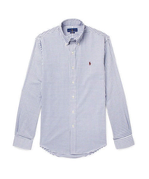A shirt as timeless and versatile as this Polo Ralph Lauren one is ideal for business meetings, weddings and just about everything in between. Cut in a neat slim fit with a box pleat at the back for added comfort, it's made from crisp cotton-poplin and patterned with a blue and white box check. Shown here with Jean Shop jeans, Polo Ralph Lauren jacket, Converse sneakers. - - Blue and white cotton-poplin - Button-down collar, buttoned cuffs, designer emblem, back box pleat - Button fastenings - 100% cotton - Machine wash - Imported