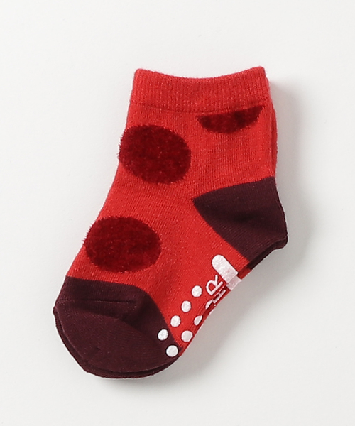 size: SS(13-15cm) S(16-18cm) M(19-21cm) L(22-24cm) ビッグドットのグラフィカルなカラーが印象的なソックス。ウール混の素材で暖かく履いていただけます。足裏にはすべり止めつきで、小さめですがお名前記入スペースもあるのが便利です。maarookから新しい雑貨ブランド「MR」が2017SSデビュー!!maarookのテイストをそのままに、機能性を重視したありそうでなかった雑貨を展開しています。