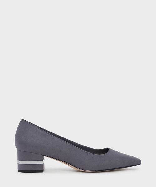 ヒールのメタリックカラーがモードなアクセントを添えるパンプス。太く安定したローヒールが履き心地良く、普段ヒールをお履きにならない方もチャレンジしやすい一足です。控えめなスクエアトゥもお洒落なアクセントに。シーズンスタイルがぐっと増すスエード調の素材で仕立てました。デイリーユースから、フォーマルシーンまで頼れるワードローブの一足としてぜひお勧めです。Blackと少しパープルみがかったGrey、秋冬のアクセントカラーにぴったりな上品な色合いのGreenの3色展開。※足幅 7.1cm 36サイズで計測しています※STAFF着用レビュー/22.5-23cm/足幅広め/足幅はやや窮屈感を感じました。サイズは36サイズでちょうどよく着用できました。