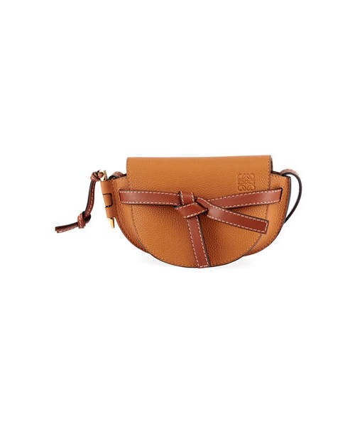 Loewe shoulder bag in soft grained calf leather. Removable shoulder strap. Flap top loops through knotted front straps. Exterior, stamped logo at front corner. Belted top loops through sides; self-ties at front. Hanging pin tassel at side. 6.5"H x 9.5"W x 4.1"D. Made in Spain.