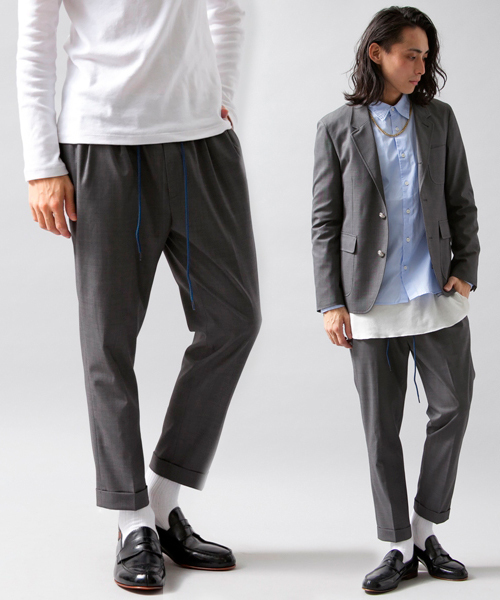 ウール/ポリエステルのスーツ生地を使用し、腰周りから裾にかけてテーパードさせた、くるぶしが見える程度のアンクル丈のイージーパンツ。スーツ生地の持つドレッシーなイメージをカジュアルダウンさせるべく、ウエストはデニム調のツイル生地で切り替え、カットソーやカジュアルなシャツとも相性が良い様に、品良くカジュアルなスラックスに仕上ました。セットアップで着用可能な同じ生地を使用したジャケットも展開しています。 店舗にてお問い合わせの際は、全国のBEAUTY&YOUTH 各店舗まで下記の品番をお申し付け下さい。 品名:MT TW EASY SLACKS 品番:1284-188-0187 model: H178 B86 W73 H89 着用サイズ:M ※画像の商品はサンプルです。 実際の商品と仕様、加工、サイズ、素材が若干異なる場合がございます。