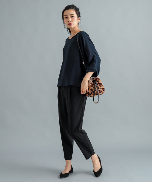 透けなくてUVカット性があるポリエステルと伸縮性のあるポリエステルの糸で仕上げたテーパードパンツです。 さらっとしたドライタッチでさらりと肌さわりが良く清涼感もあるため、残暑の残るこれからの季節にピッタリです。 ヒップ周りと裾幅もゆったりとしたシルエットになっているので、ストレスフリーで履いて頂けます。 ウエストの両脇もゴムの仕様になっていますので、 きれいにかつ履きやすい一枚に仕上げました。 きちんとお仕事着はもちろん、プライベードでも着用頂ける一品です♪