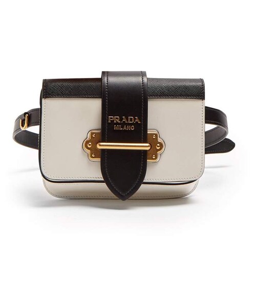 Prada's coveted Cahier shape it designed to resemble a secret notebook and this white leather belt bag version is a versatile iteration. It features black saffiano panels and signature gold-tone metal hardware and can be carried by the detachable black belt or cross-body chain. Wear it to cinch the waist of a cashmere jumper swapping for the chain strap in the evening.