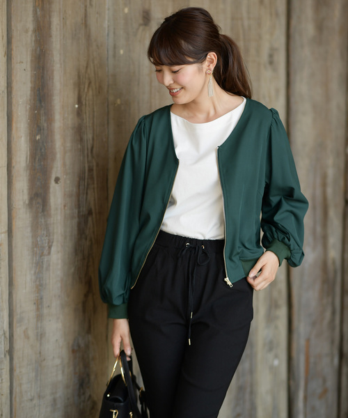 ボリューム袖でしなやかに着こなすジャケットブルゾン ほどよいボリュームとドレープが作るニュアンスのあるスリーブラインが女性らしいブルゾン。袖山と袖口のギャザーがしなやかな袖のシルエットを描きます。 ボリュームボトムスとも相性が良く脚長効果も期待できるショート丈。 襟元はV字で全体をすっきりまとめます。 カジュアルからきれいめまで幅広く使えるアウター♪ 裏地なし 伸縮性なし 薄手 前開きファスナー サイドポケットあり 洗濯:手洗い可