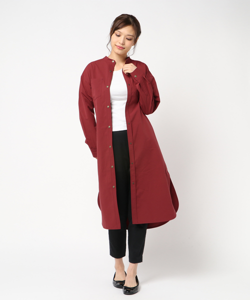 一見するとガーリーなシャツワンピースながら、最先端の持続撥水処理でアウトドアスペックの機能性を追加。レインウェアとしても着用できる、使用範囲の広い1着です。フロントボタンにはドットボタンを採用。ウェストベルトも付属し、アウターとしてのデザインを際立たせました。カジュアルな印象のバンドカラーデザインもポイント。