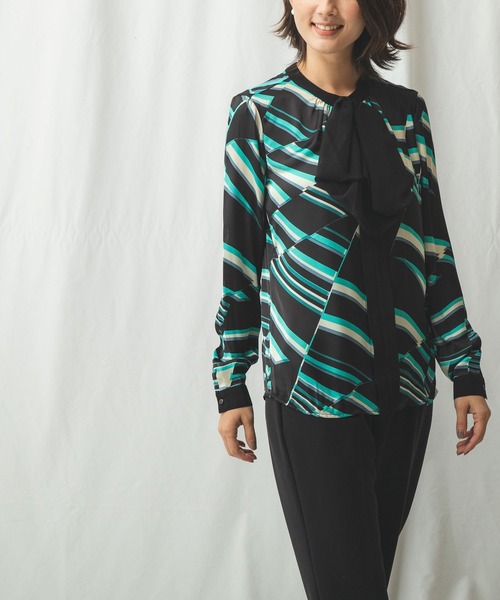 ポップな中にもエレガントさの感じられる、リボン付きの長袖プルオーバーブラウスです。イタリアでプリントされたオリジナルのジオメトリック柄は、コントラストを効かせた配色が魅力。ツヤのあるサテン素材でリッチな落ち感を堪能できます。前立てのような無地のフロント切り替えがポイントに。リボンはループに通してある状態となっていますので、リボンなしでも着用いただけます。後ろボタン1個。【 NARA CAMICIE 】イタリア生まれのシャツ・ブラウスブランドNARA CAMICIE(ナラ カミーチェ)レディースを中心に、イタリアならではの豊富なデザインと多彩なカラーバリエーション、女性らしく見せる立体的パターンで美しいシルエットが特徴です。シャープなシャツからフリルやレースをあしらったブラウスはスーツのインナーやオフィス、フォーマルなコーデと幅広く活躍!●お買い物をお得にもっと楽しく!上手な活用方法>>>▼商品のお気に入り登録▼完売カラーの再入荷通知や、ラスト1点の通知、プライスダウンしたセール通知も受け取ることができます。▼ブランドのお気に入り登録▼新作や再入荷等、いち早くブランドのお得な情報を受け取ることができます。【ご注意】・屋外の光や照明の当たり具合で、実際の商品の色味とカラー別画像の色味に若干の違いが発生する場合がございます。