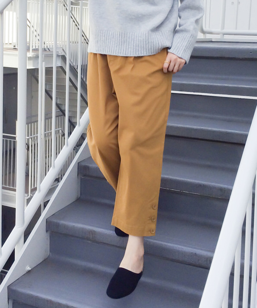 裾に3つのボタンを並べたクロップド丈パンツ。腰回り、ヒップがゆったりで裾に向かって少しテーパードさせた履きやすいシルエットです。今年人気が上がっているクロップド丈は、カラーソックスをチラ見せしたり、ハイカットのスニーカーなどとも相性バッチリ♪ストレッチが入っているため動きやすいです。後ろは飾りポケット、裾のボタンは開かない仕様です。[クリーニング]洗濯機洗い可(非常に弱く) ドライクリーニング可(P) ウェットクリーニング(W)[洗濯方法]洗濯の際はネットを使用してください