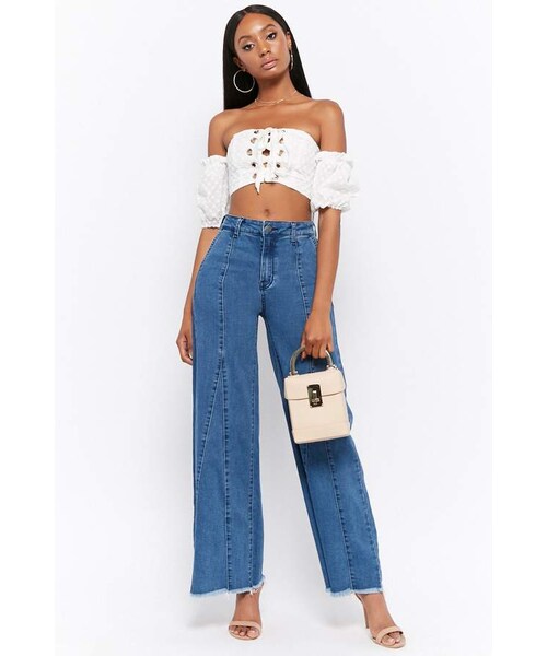 Details A pair of flared jeans featuring exposed seam detailing, a high rise, zip fly, slant front pockets, and a frayed hem. Content + Care - 75% cotton, 21% polyester, 2% spandex, 2% viscose - Hand wash cold Size + Fit - Model is 5'7" and wearing a Small - Inseam: 31" - Waist: 25" - Rise: 10.75"