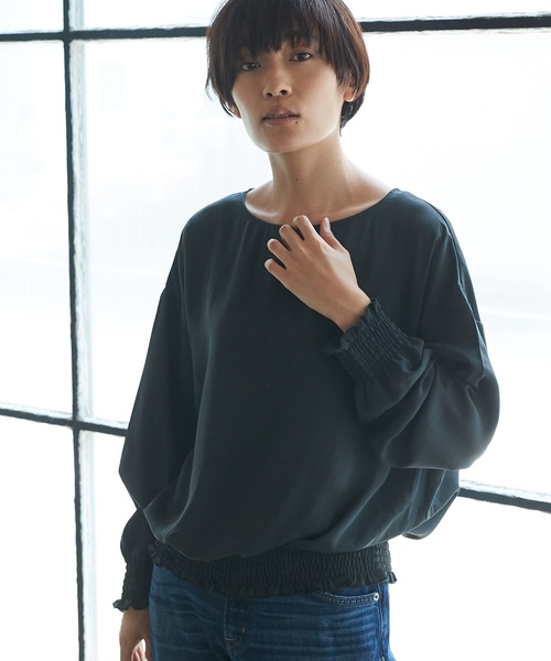 シャーリングを寄せたメリハリシルエットが女性らしさを印象づけるブラウス。鎖骨が綺麗に映えるネックラインがヌケを添えるポイント。さらりとした風合いで着心地も快適です。合わせるボトムを選ばないアイテムは、ワードローブの強い味方です。