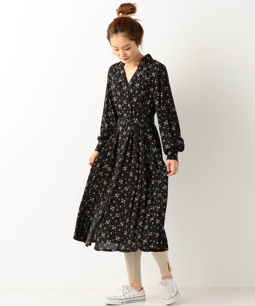 ■ちりばめられた花柄がフェミニンなトレンチワンピース■ バックスタイルはプリーツになっているのがポイント。 柔らかな生地感がひらひらと女性らしいドレープを表現してくれます。 デニムやレギンスをレイヤードしても今年らしい着こなしに◎