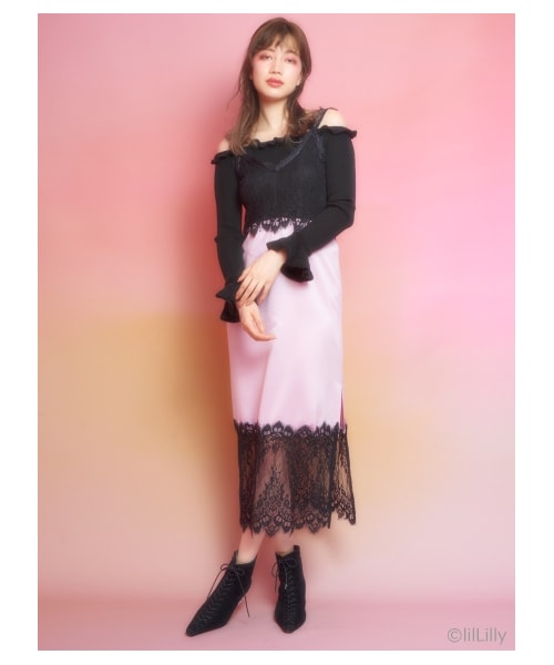 鎖骨がキレイに際立つオフショルダーのニット。ネックレスなどの小物が良く映えるので、スタイリングも楽しめそうです。フリル状のふわふわとした生地端に甘いムードが漂うアイテム。リブ編みのコンパクトなシルエットが女性らしいラインを描き出します。