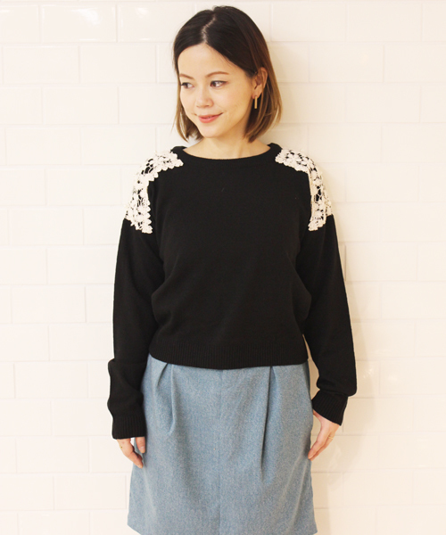 mystic(ミスティック) 肩のレースがさりげなく可愛いニットです。すっきりとしたシルエットでどんなコーディネイトにも相性別群です◎ カラー展開も豊富なのでお気に入りの色を見つけて下さい!