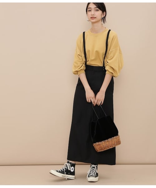 ミニマルな台形(トラペーズ)シルエットのスカートに、取り外し可能な共布ベルトがついたジャンパースカート。フロント部分のメタルギボシがアクセントになっています。後ろ部分はウエストゴムで、さらにベルト裏の両サイドの調整タブでサイズ調整が出来る為自分にあった丁度良いサイズで着て頂けます。ウール見えの合成繊維でナチュラルなウールのような杢っぽい表面感も再現された素材。合成繊維なのでご自宅でお洗濯が可能◎お手入れも楽でデイリーの着こなしで活躍します。インナー次第で変わる着こなしを楽しめ、スカートとして使えるのでスタ