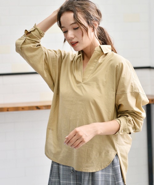 デコルテをすっきりと魅せるスキッパーネックのシャツ。シルエットはややゆとりのあるドロップショルダーで、こなれ感のあるリラクシングな装いを演出します。無地・ストライプ・チェック柄の豊富なバリエーションで取りそろえているので、お気に入りの一枚がきっと見つかります。