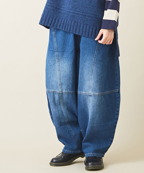 ■定番アイテムだからこそ、変形シルエットで差をつけて。みんなが持っている定番アイテムだからこそ、個性的なデザインで周囲に差を付けたいですよね。ボールのような縫い目が特徴的なデニムパンツが登場です。パンツ全体に張り巡らされたステッチで、360度どこから見てもユニークな着こなしが完成。ヒップのポケットにはジグザグステッチを施して遊び心を味付ています。ふっくらと丸みを帯びたバルーンシルエットで女性らしさを感じるデザインです。■毎日穿きたいイージーデザインウエストは総ゴムのラクチンデザイン。内側に通したヒモを絞ればお好みのフィット感に調節できるので、ハイウエストでの着こなしもおススメです。サイドとヒップにはポケットをセッティングし、機能性もバツグン。■ビンテージの色合いが表現されたこだわりのディテール太もも部分やステッチ周りには細かな色落ちの風合いが表現され、ずっと前から穿いていたかのようなユーズドの雰囲気が◎届いたその日から古着のような着こなしが楽しめます。着慣れるうちに作られる、自分だけのアタリやシワを味わいながら愛用していただければと思います。■-fabric-オールシーズン使いやすい10オンスデニム薄すぎず厚すぎず、オールシーズン穿けるちょうどいい生地感です。ゆったりとしたデザインなので、寒い時期には下にレギンスを履いて防寒対策をすることもできます。暖かい時期には風通しもよく、季節を問わず履けますね。スニーカーだけでなくブーツやサンダルなど、幅広い足元コーデが楽しめます。【アイテムカテゴリ】ボトムス パンツ ズボン フルレングス サルエルパンツ サルエルデニム イージーパンツ イージーデニム コクーンパンツ ワイドパンツ【シルエット】ワイド ルーズ ラフ コクーン バルーン ゆるまた 股上深め サルエル ロング丈 フルレングス 10分丈 【デザイン】ウエストゴム 総ゴム ポケット 切替 切り替え ビンテージ ヴィンテージ ユーズド 古着 リメイク【生地・素材】コットン 綿 デニム 無地 単色 ワンカラー【ファッションテイスト】アメカジ アメリカンカジュアル ナチュラル タウンユース アクティブ シンプル カジュアル 大人カジュアル【シーズン】 秋 冬 秋冬