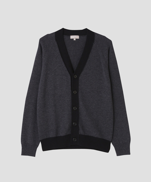 柔らかなウールコットン素材のラグランスリーブのカーディガン。 衿、前立て、裾にブラックの配色がある、身頃とのコントラストが特徴的なカーディガン。 様々なカットソー、シャツと相性がよく、デイリーに使う事の出来るアイテム。