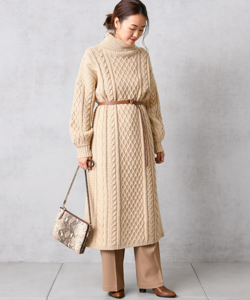 立体感のある編み地がデザインポイントになったアラン柄ニットワンピース温かみのある雰囲気が特徴で、真冬の着こなしにもピッタリです。レギンス合わせやワイドパンツなどと合わせて頂くのもおすすめです。1枚で主役になってくれるワンピースです!