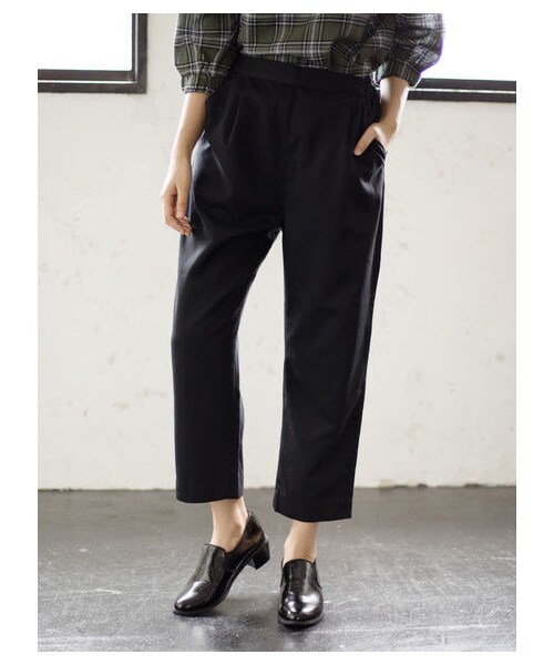 落ち感のある柔らかな生地を使用したイージートラウザーパンツ。 レッグラインをすっきりと綺麗に見せてくれるテーパードシルエットもポイントです。 ウエストはバックのみゴム仕様にすることで、楽な穿き心地ながらも、キチンと感もしっかりとキープしてくれる1枚◎
