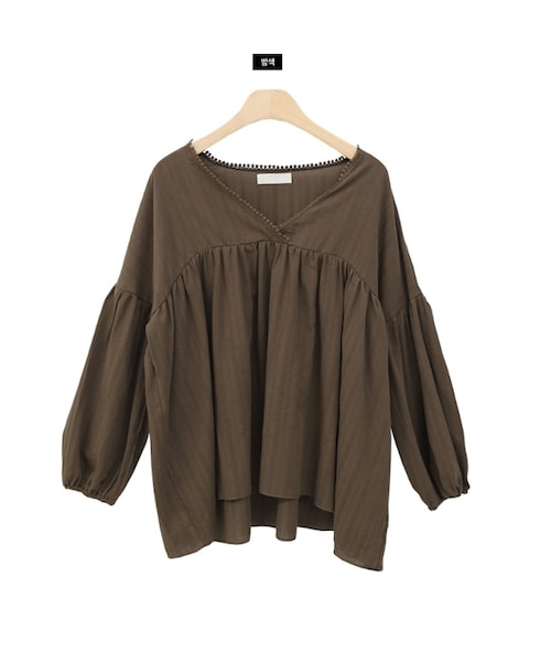 ラブリーなVネックブラウスを紹介します。 胸元からギャザーに切り替えてふんわりボリューミーなシルエットがラブリー。 サロペットやスカートとのフェミニンコーデがおすすめです。