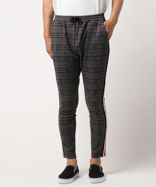 ストリート感覚の定番シルエットとして提案されるラインパンツ◇DETAIL◇ ポンチ風のカットソー生地にチェックのプリントをして仕上げました。テーパードをしっかり効かせ綺麗な人気のシルエットを演出。トレンドのサイドのラインがオシャレ感をプラス。人気のチェック柄と相まってスタイリングもしやすくおすすめな1着。ボアコートや旬なBIGニットとも相性抜群。ウエストがゴム仕様になっているのでゆったりと着用する事ができます。【RINGS/リングス】クリエイティブチームがデザインする〔RINGCO.LTD〕のメインブランド。東京在中のデザイナー達が肌で感じたその時々の感性を出し合い、〔おしゃれの先行発信〕をテーマにストリート系リアルクローズを提案していきます。
