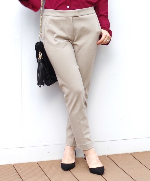 脚のラインをすっきりと見せる、テーパードラインの9分丈パンツ。動きやすさ抜群のポンチ素材を使用しました。しっかりとした生地感でインナーが響きにくいのが特徴です。同素材のバリエーションでポンチタイトスカート(30-82-08-107)も用意があり、ポンチテーラードジャケット(30-82-21-105)、ポンチスタンドカラージャケット(30-82-21-106)、ポンチフリルジャケット(30-82-21-109)に合わせてスーツ対応も可能です。