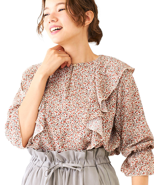 前後2WAYで着られる小花柄ブラウス♥華やかな多色使いが特徴的な1枚です。さらっと軽い素材で爽やかな着こなしにアシスト。 レトロな雰囲気たっぷりのフレア袖と、cute な小花柄がコーディネートを盛り上げます。 ネックの涙開き部分を前にして着て頂くのがおおすすめの着こなしです。女性的で抜け感のある印象に仕上がります。シンプルなボトムに合わせてスタイリングの主役に♪ハイウエストのパンツやスカートにウエストインしても◎