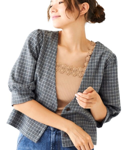 取り入れるだけで秋を感じさせてくれるチェック柄ジャケット。細かいチェック柄とさりげなくキラキラ輝く生地がとにかく可愛い! ノーカラーの深めにあいたVネックと7分丈のパフスリーブで、女性らしさを意識してお作りしました。 ジャケットに慣れていない方でも取り入れやすい、flowerらしい柔らかさのあるジャケットです。 お食事会などの、いつもよりきれいめなお洋服を着たいシーンにピッタリです。Tsをインナーにしてデニムと合わせたカジュアルなコーディネートも◎ブリティッシュなチェックほどかっちりしすぎないので、polish check pantsと合わせたセットアップのコーディネートもぜひ挑戦してみてください♪