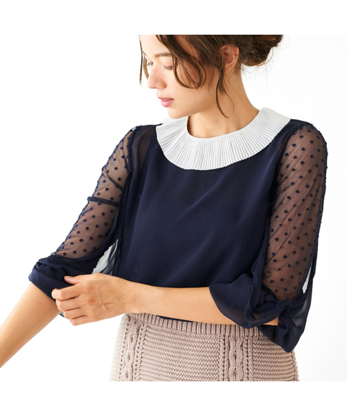 柔らかいシフォンの質感が上品な、flowerらしい華やかブラウス☆細かくプリーツを施した衿が顔周りを華やかに見せてくれます。柔らかいドットチュールを使用した袖はシフォンで包み込むようなかたちにして、気になるところはカバーしてくれるデザインに仕上げました!身頃は生地を2枚重ねにして透けすぎないようにしているので、色々なインナーを合わせられるのも嬉しいポイント!シフォンとチュールの異なる透け感が楽しめて上品さもある、ふわっと軽いブラウスです。配色が遊び心のあるGRN、NVYと、同系色でまとめた麗しいBEGの3色展開です。デニムなどカジュアルなアイテムはもちろん、pohish check pantsなどきれいめな柄物ボトムとのコーディネートもオススメです。