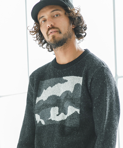 181cm 66kgのモデルがMサイズを着用 ウール混の少し起毛した糸を使用したカモフラージュ柄を切り抜いたデザインのセーター。 円形、四角形、星形に切り抜いたデザインはアウターを着用した際にもフロントスタイルにアクセントを加えてくれる一枚。 ふんわりと暖かみのある素材とモノトーンで統一した配色で大人なセーターに仕上がりました。 日本製。 ※着用画像と商品単体画像で色が異なる場合がございます。 ※商品単体画像を実物により近づけております。