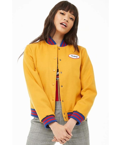 Details From our special Forever 21 x Disney collection celebrating Mickey Mouse, a luxe fleece varsity jacket featuring light padding, quilted lining, contrast ribbed trim with stripes, a snap-button front, long sleeves, and slant front welt pockets. This mid-weight jacket is complete with an embroidered "Mickey" patch on the chest and Mickey character and text patches on the back in Japanese. - ©Disney Content + Care - Shell: 94% polyester, 5% rayon, 1% spandex - Lining & Filling: 100% polyester - Dry clean Size + Fit - Model is 5'8" and wearing a Small