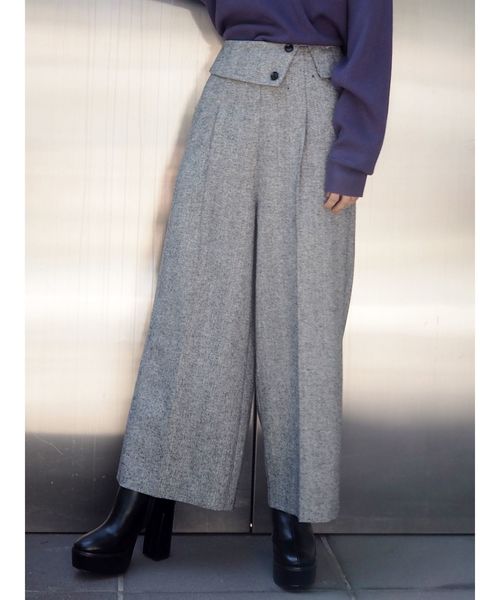 ストンとしたシルエットでマニッシュなワイドパンツ。 ハイウエストになっていて脚長効果も期待できます。 ■アイテム ウエストの折り返しデザインとボタンが程よいアクセントに。 旬を掴んだこなれスタイルが完成するマストで抑えておきたいトレンドアイテムです。 ■コーディネート カジュアル:エッジの聞いたトップスがおすすめ。 フェミニン:きれいめなボトムなのでどんなニットでもOK。特にローゲージニットがおススメです。