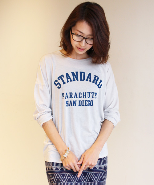 大人気のアメカジテイストな都市プリントTシリーズから、軽やかな春夏素材で新登場♪ ドロップショルダーのボーイッシュなシルエットが今シーズンのトレンド気分にピッタリです。 クラシカルな半端丈パンツやタイトスカート等と合わせたミックス感のあるスタイリングもオススメ。 まだ寒い時期でもジャケットのインナーとしてもインパクト大! オールシーズン大活躍の1着で、大人のデイリーコーディネートを是非お楽しみ下さい。 model:身長163cm 着用サイズ:F 品名:□BBC SANDIEGO 8S 品番:1612-299-3548 ※画像の商品はサンプルです。実際の商品と色味、仕様、加工、サイズ、素材等が若干異なる場合がございます。