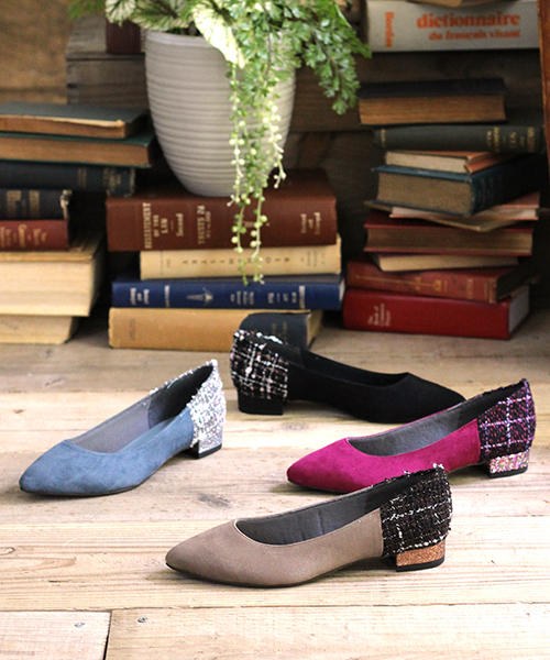 今年注目のツイード素材をかかとにあしらった洒落見えパンプス。 シーズンムード◎なカラー展開で、秋コーデを足元から先取り。 グリッターヒールがキラッと上品な印象に仕上げ、コーデを格上げしてくれる一足です。 安定感があり、足が疲れにくいローヒールはヒールが苦手な方にもオススメ。 インナーにはウレタンを使用し、ソフトな履き心地です。