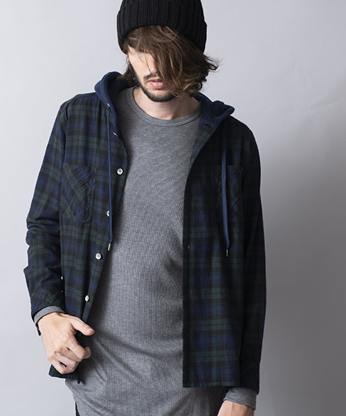 古着のデザインからインスパイアを受けたパーカとデニムシャツが1つにまとまったフェイクレイヤードスタイルを楽しめるフードシャツ。 今作はトレンドのチェック柄とフードにはコットン裏毛を使い馴染みの良い風合いに仕上に。 季節を問わず羽織りやすい生地感で重ね着に適した一着となっている。