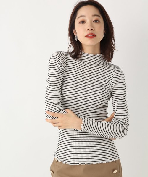 シルク10%入りのリブ素材で仕立てたハイネックカットソー。 肌さわりの良さはこれからのインナーアイテムに最適です。 サイドに縫い目のない丸編みリブで身体のラインをすっきりとキレイに見せてくれます。 襟ぐり、袖口、スソを繊細なメロウで仕立て、長めの袖が今年らしいアイテムです。